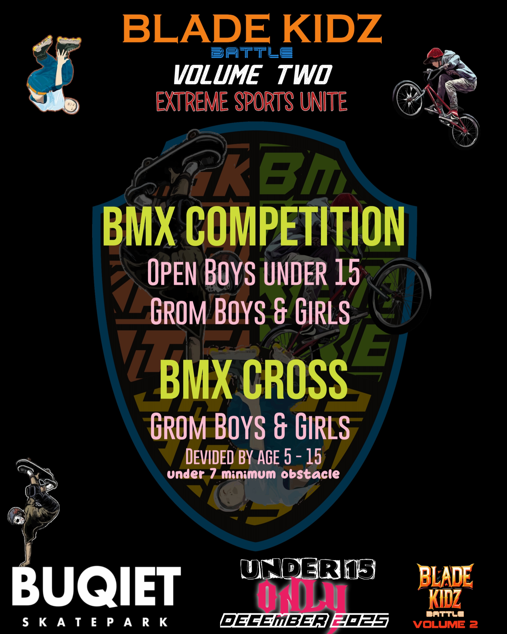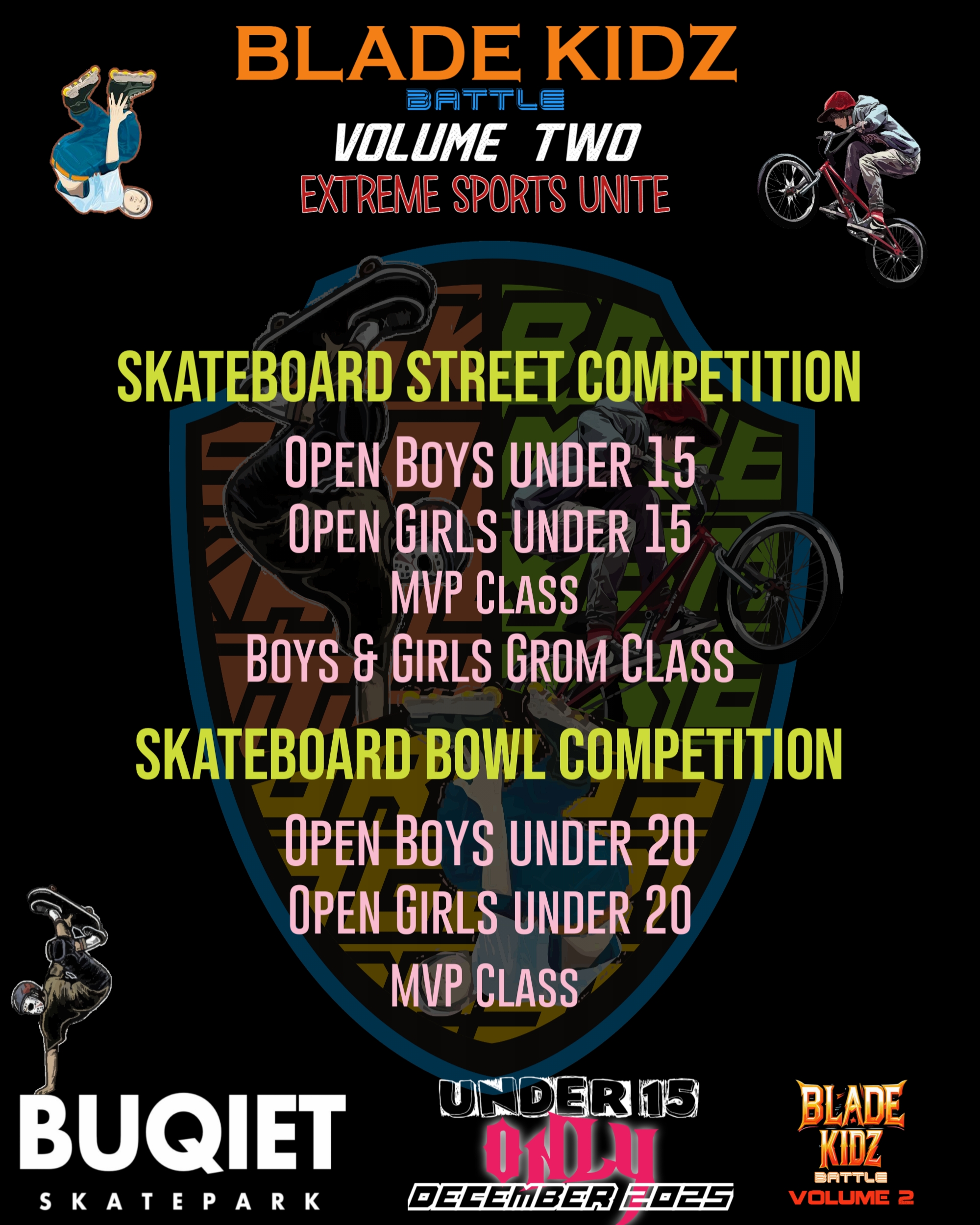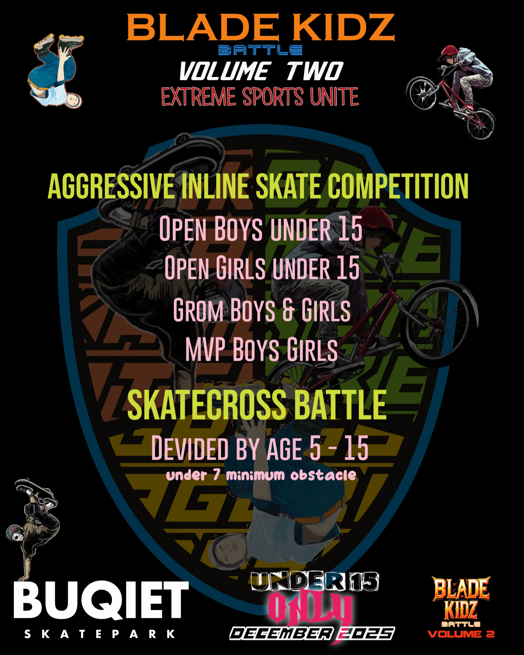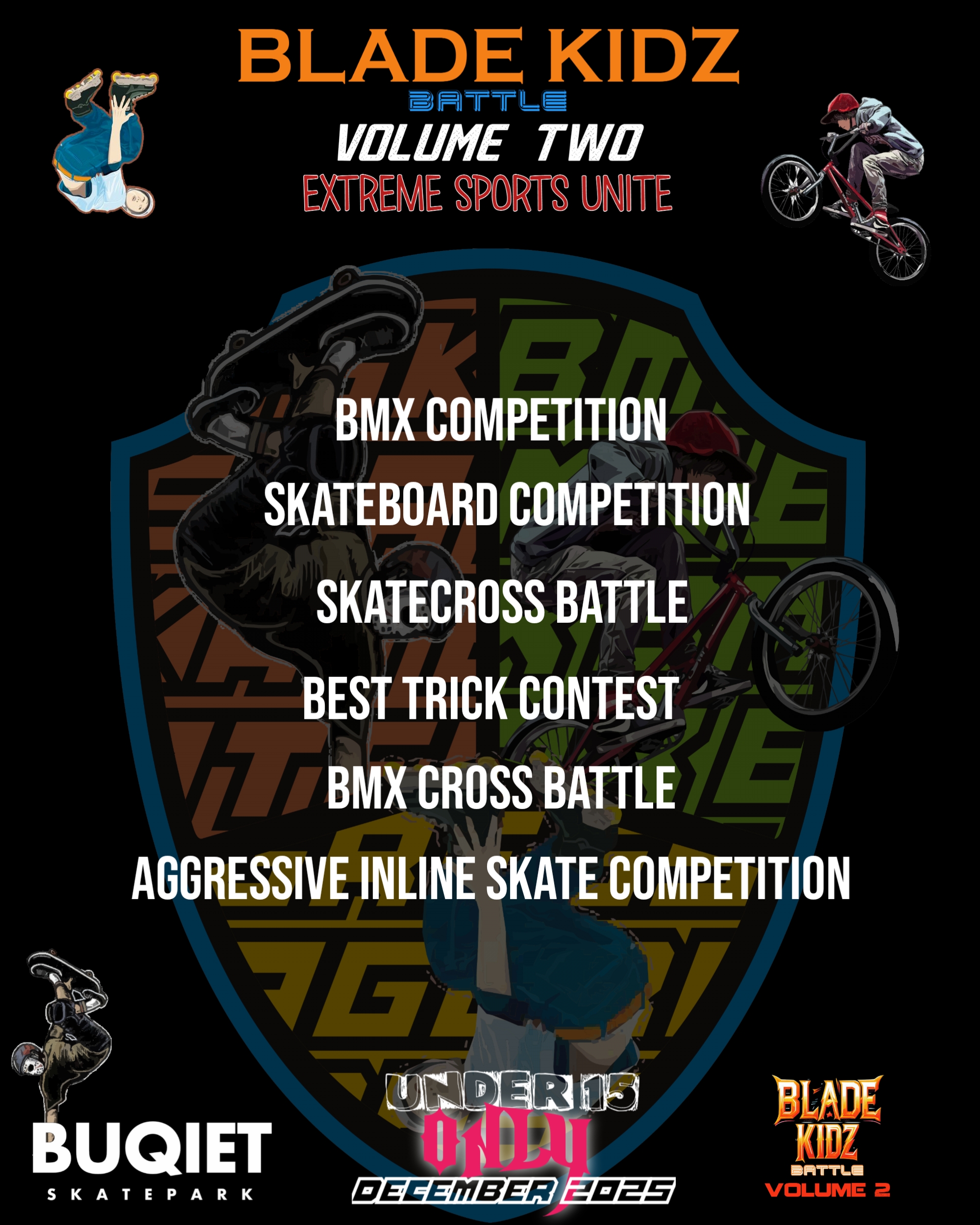 Terima kasih sudah kembali berpartisipasi dalam rangkaian acara kompetisi ini. Kami akan jabarkan apa saja dan bagaimana kompetisi Blade Kidz Battle VOL 2 ini nanti akan dilaksanakan. Kompetisi ini diperuntukan untuk semua anak anak berumur maksimal 15 tahun. Kompetisi kali ini memiliki warna baru dengan tema “Extreme Sports United” yang dimana 3 nomor cabang extreme sport akan di pertandingkan, yaitu Aggressive Inline Skate, Skateboard dan BMX.  Skatecross akan tetap lebih seru karena akan menggunakan halang rintang sama halnya juga dengan tambahan nomor p[ertandingan baru yaitu BMX Cross. Blade Kidz Battle Volume Two ini memiliki harapan untuk menyatukan semua pemain olahraga Extreme, terutama untuk memfasilitasi anak anak yang sudah berlatih dan memberi wadah untuk menguji kemampuannya bermain olahraga ini. Mari kita junjung sportifitas dalam berkompetisi sehingga terwujud lingkungan latihan dan kompetisi yang bersih dan sehat. “Jangan lupa bersenang senang Boys & Girls”. Selamat bertanding. Pertandingan akan dilaksanakan di Buqiet Skatepark Bandung.
