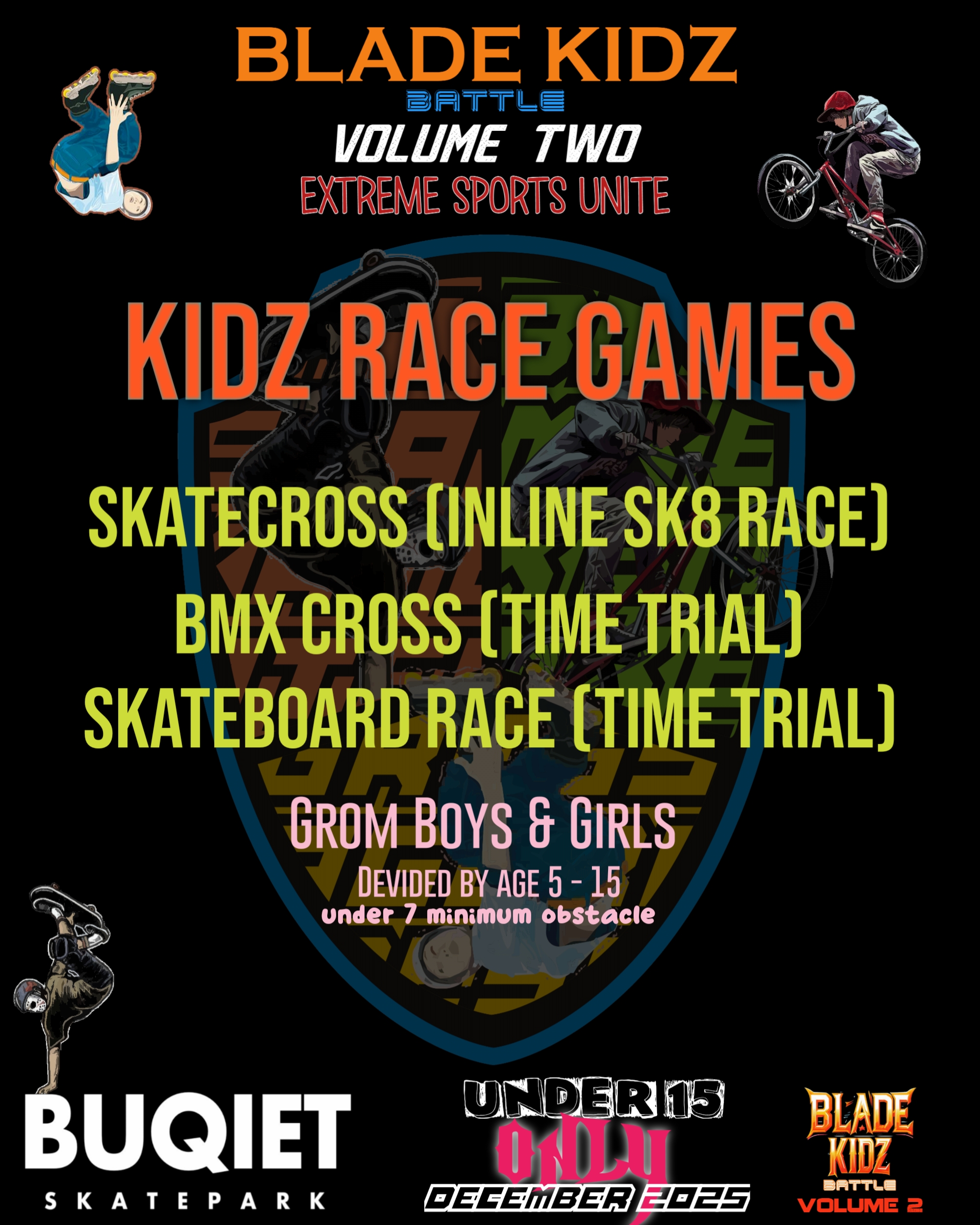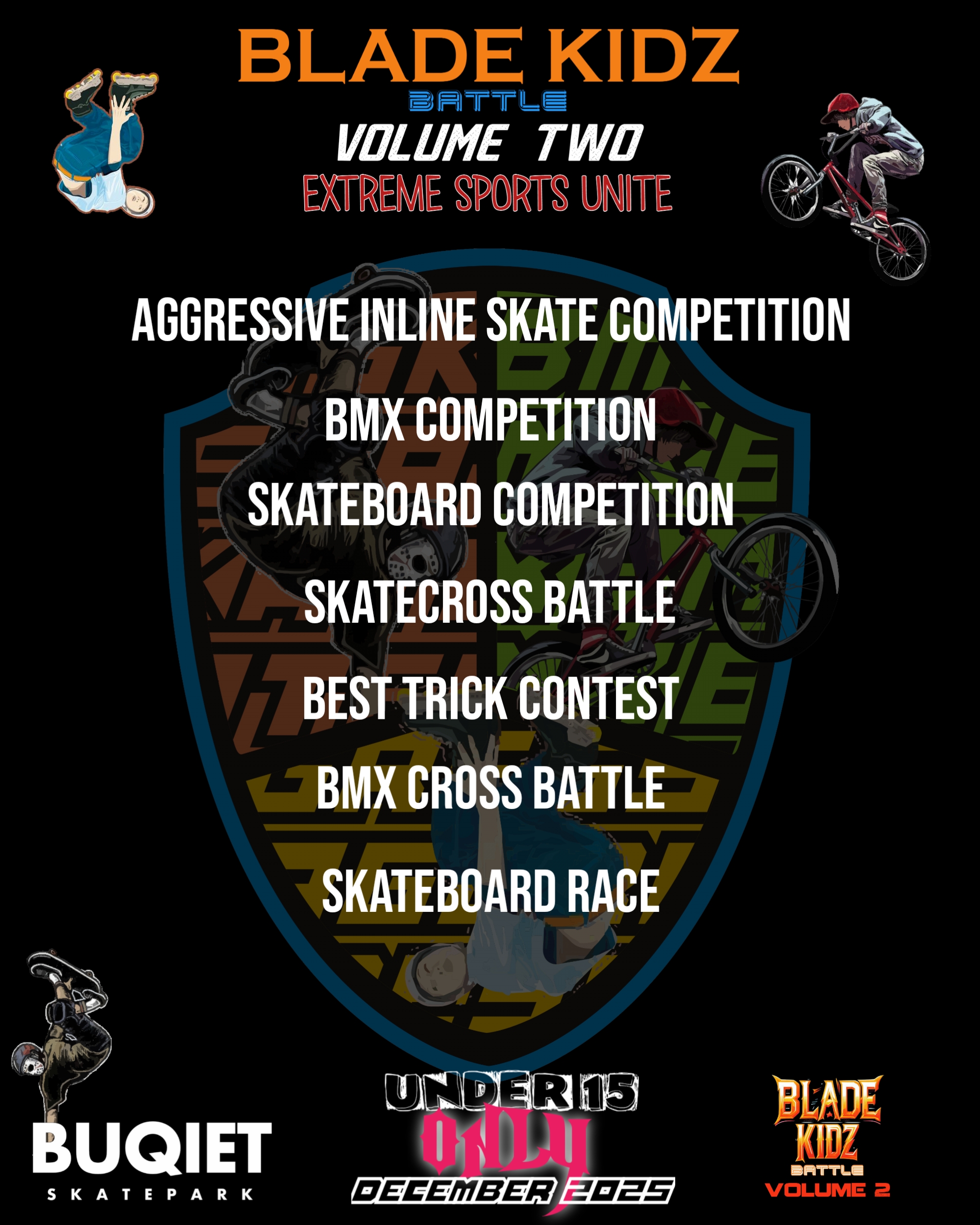 Terima kasih sudah kembali berpartisipasi dalam rangkaian acara kompetisi ini. Kami akan jabarkan apa saja dan bagaimana kompetisi Blade Kidz Battle VOL 2 ini nanti akan dilaksanakan. Kompetisi ini diperuntukan untuk semua anak anak berumur maksimal 15 tahun. Kompetisi kali ini memiliki warna baru dengan tema “Extreme Sports United” yang dimana 3 nomor cabang extreme sport akan di pertandingkan, yaitu Aggressive Inline Skate, Skateboard dan BMX. Skatecross akan tetap lebih seru karena akan menggunakan halang rintang sama halnya juga dengan tambahan nomor p[ertandingan baru yaitu BMX Cross. Blade Kidz Battle Volume Two ini memiliki harapan untuk menyatukan semua pemain olahraga Extreme, terutama untuk memfasilitasi anak anak yang sudah berlatih dan memberi wadah untuk menguji kemampuannya bermain olahraga ini. Mari kita junjung sportifitas dalam berkompetisi sehingga terwujud lingkungan latihan dan kompetisi yang bersih dan sehat. “Jangan lupa bersenang senang Boys & Girls”. Selamat bertanding. Pertandingan akan dilaksanakan di Buqiet Skatepark Bandung.